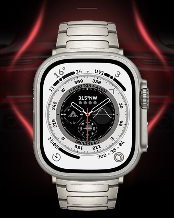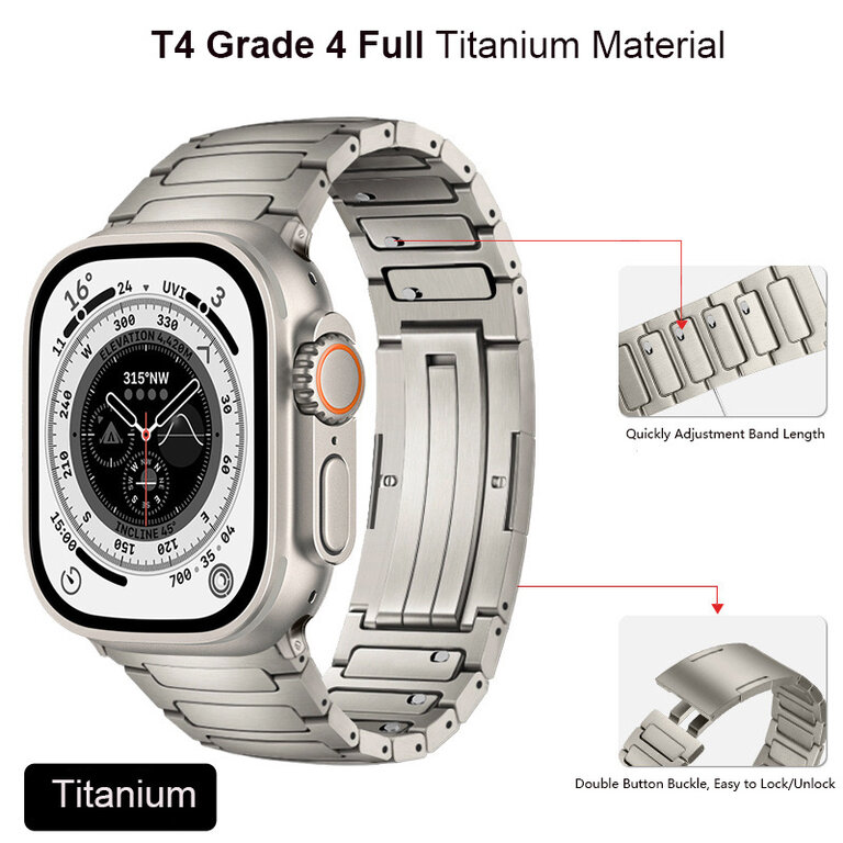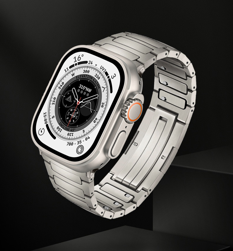 Vanaf nu beschikbaar in grade-4 titanium met vouwsluiting. Kan zowel op de Apple Watch 46mm als 49mm ultra gedragen worden. Geen tool nodig om de band op maat te maken. (wordt zonder Apple Watch geleverd)